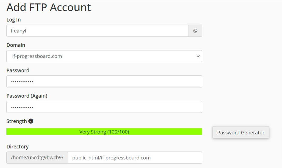 Go to FTP Manager Login: Username such as “Ifeanyi” Domain: Select the Website to have access to Password: Select a strong password or Generate a Password Directory: Select the path […]